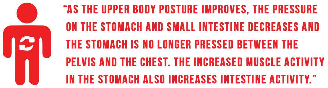 As the upper body posture improves, the pressure on the stomach, small intestine and colon decreases and the stomach is no longer pressed between the pelvis and the chest. The increased muscle activity in the stomach area also increases intestine activity. All this has a positive effect on the bowel movements (peristalsis and its efficiency) and intestine health. In our modern lifestyle the intestine health is weakened also by too little of muscle activity. One-part chairs (traditional or saddle) also press the anus and rectum, slowing down or postponing the evacuation reflex. Slow intestine activity or long stay of food in the body is involved in common intestine illnesses from which a large part of the population suffers. Sitting with good posture would be a strong preventive measure.